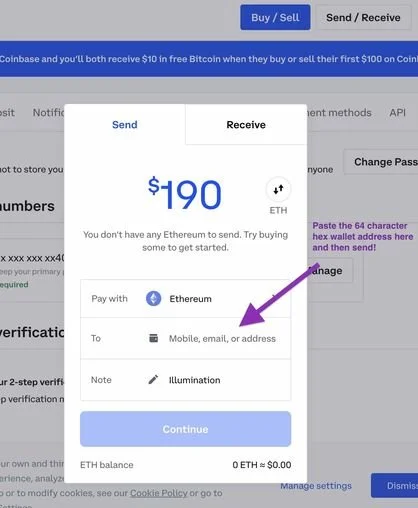 Step 5: Go back to your Coinbase and use the metamask ethereum address you copied to send yourself ethereum from Coinbase to Metamask (feel free to do a test transaction of $15 to try if you have never done it before!)